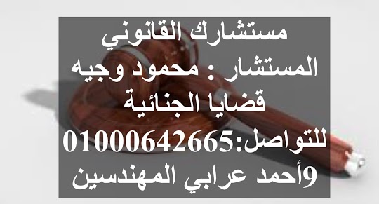 مستشارك القانوني للمحاماه و الاستشارات القانونيه متخصص في لقضايا الجنائيه مثل - قضايا القتل والشروع فيه - قضايا الضرب والجرح المسبب الى عاهة مستديمة او المسبب الى موت - قضايا النصب - قضايا الرشوة - قضايا السرقة قضايا الاختلاس - قضايا السلاح - قضايا الاتجار في المخدرات او تعاطيها - قضايا السب والقذف - قضايا الاعمال المخلة بالشرف والامانة والنظام العام - و الخ...... #محامي_ القضايا_ الجنائيه _في _مصر #محامي_ القضايا_ الجنائيه _بمصر #اشهر #محامي_ قضايا _الجنائيه _في _مصر #مكتب_ القضايا_ الجنائيه _في_ مصر #افضل_ محامي_ جنائي_ في _مصر #مستشارك_القانوني_ للمحاماه_ للقضايا_ الجنائيه -اجراءات_ القضايا_ الجنائيه _في _مصر. لمعرفه التفاصيل و العقوبات تواصل علي 01000642665 01148500092 العنوان 9احمد عرابي سفنكس المهندسين